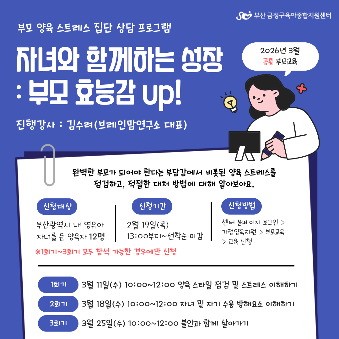 2026년 3월 부모 양육 스트레스 집단상담 「자녀와 함께하는 성장 : 부모 효능감 up!」 참여자 모집