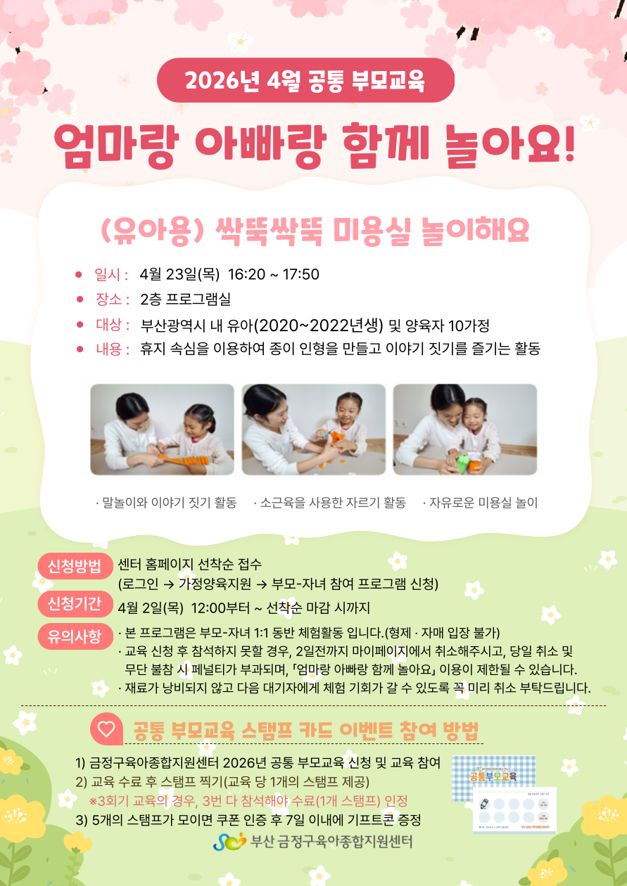2026년 4월 공통 부모교육 「엄마랑 아빠랑 함께 놀아요」 체험활동 안내