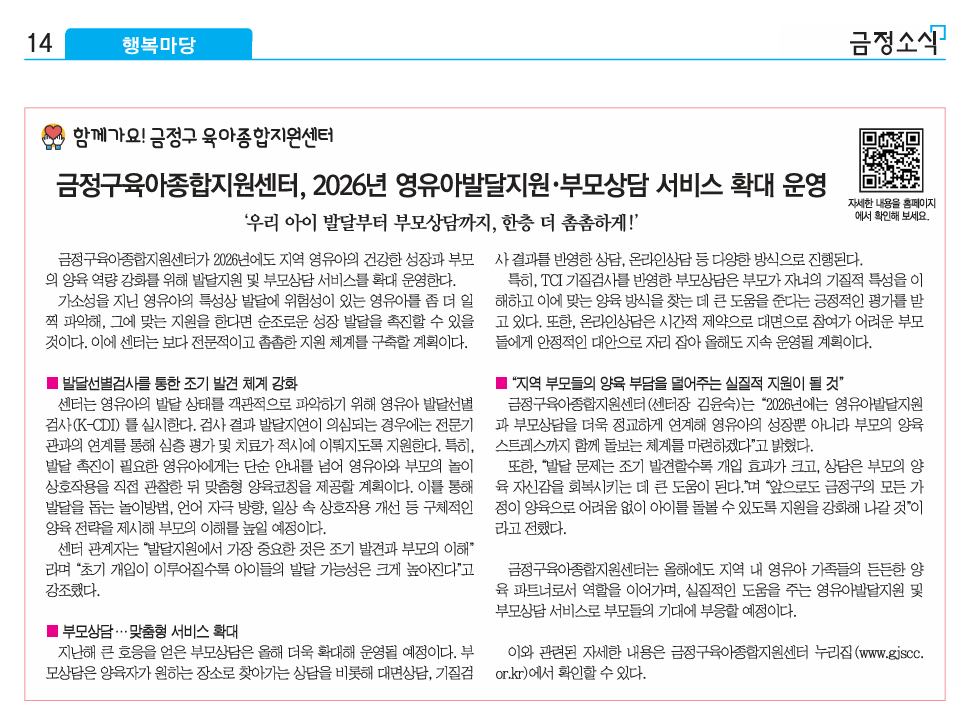 (금정소식 1월호) 2026년 영유아발달지원, 부모상담 서비스 확대 운영