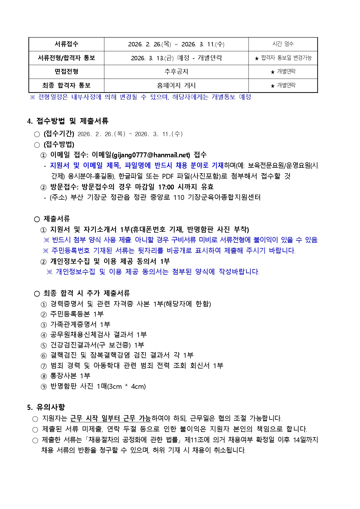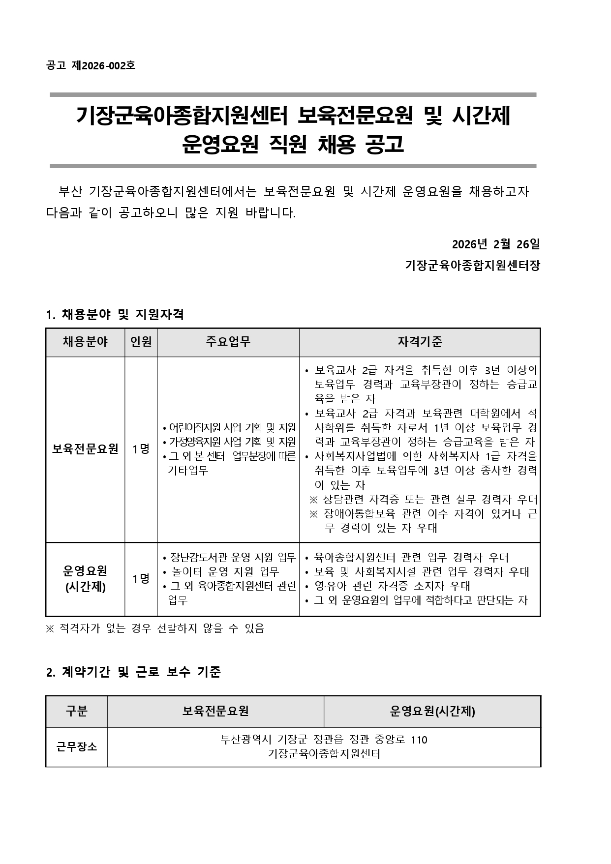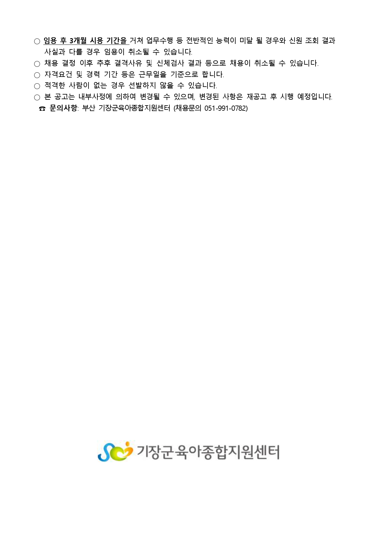 [기장군육아종합지원센터] 보육전문요원 및 시간제 운영요원 직원 채용 공고