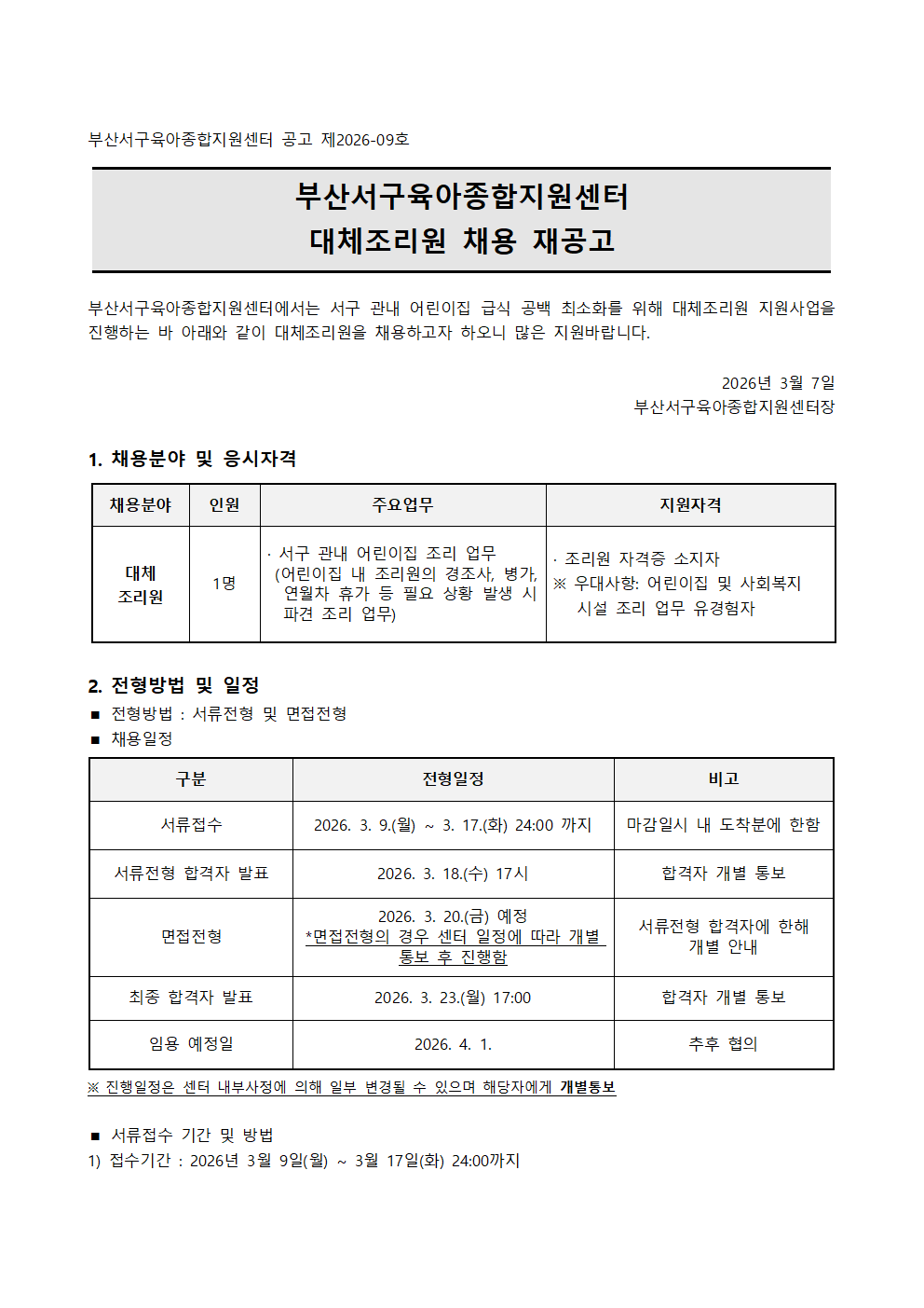 붙임1. 부산서구육아종합지원센터 대체조리원 채용 재공고.hwp