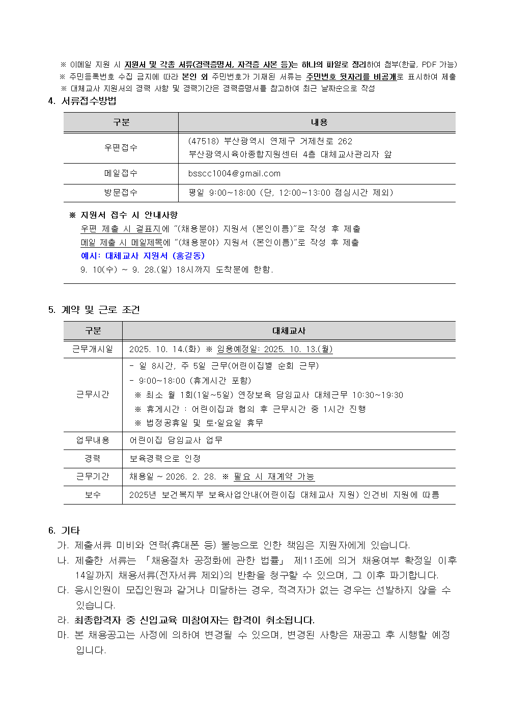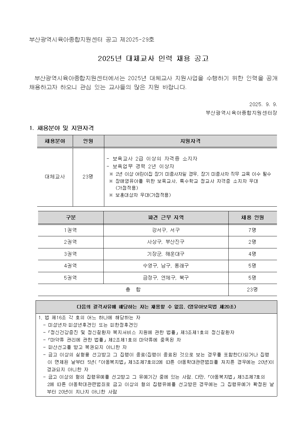 [부산광역시육아종합지원센터] 대체교사 인력 채용공고