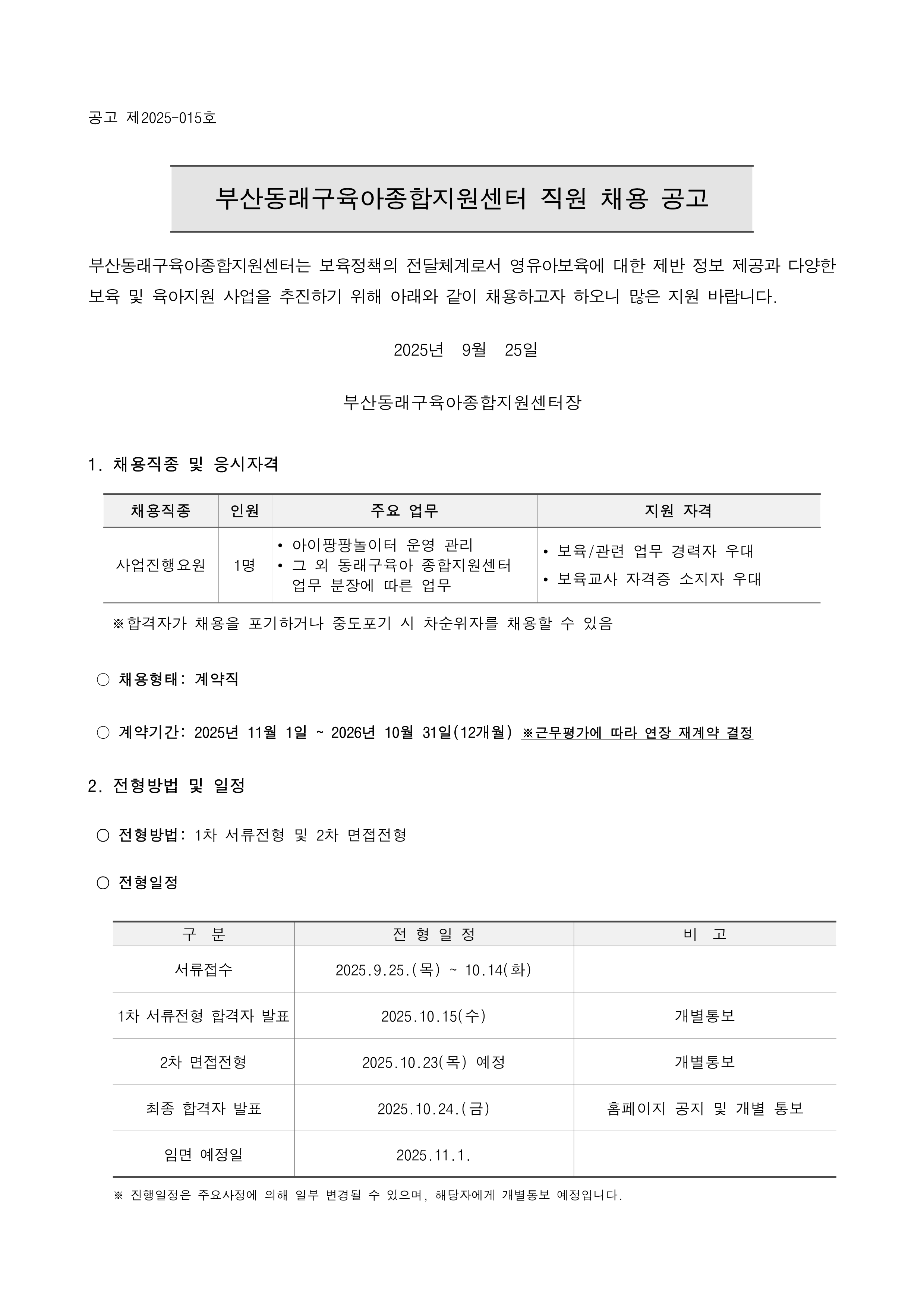 [부산동래구육아종합지원센터] 직원 채용 공고