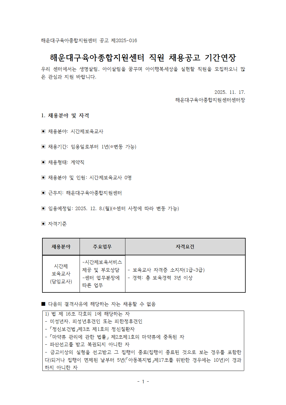 [해운대구육아종합지원센터] 직원(시간제보육교사) 채용공고 기간연장