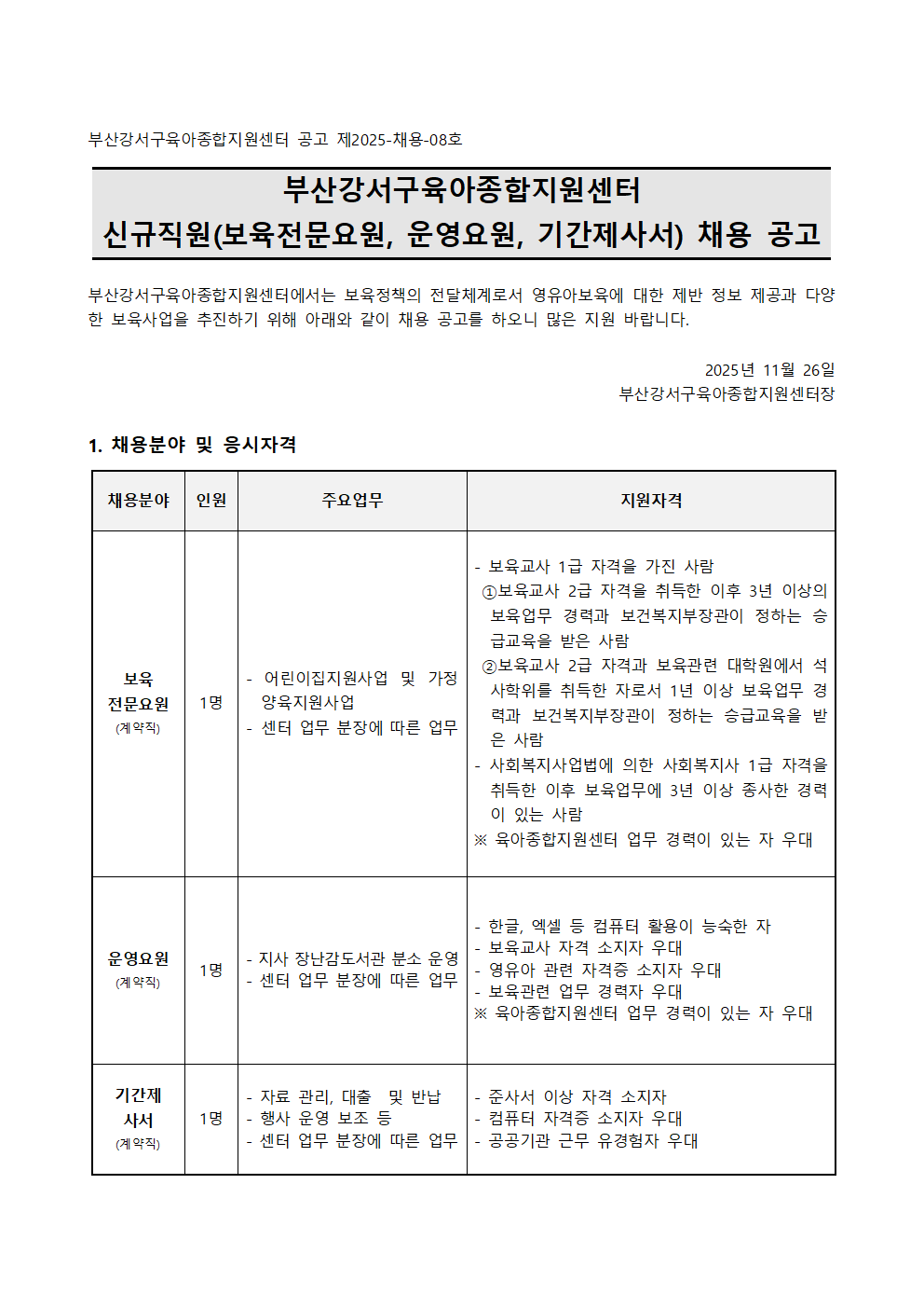 붙임 1_ 부산강서구육아종합지원센터 신규직원(보육전문요원, 운영요원, 기간제 사서) 채용 공고문.hwp