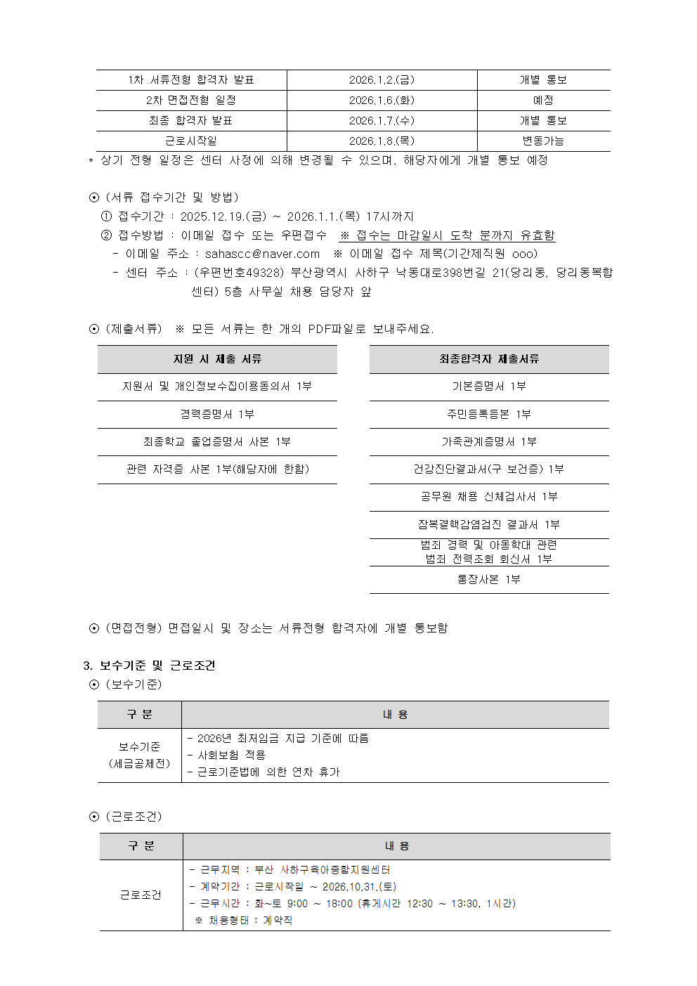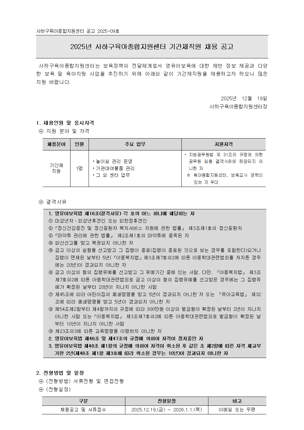 (사하구육아종합지원센터 공고 2025-09호) 사하구육아종합지원센터 기간제직원 채용 공고.hwp