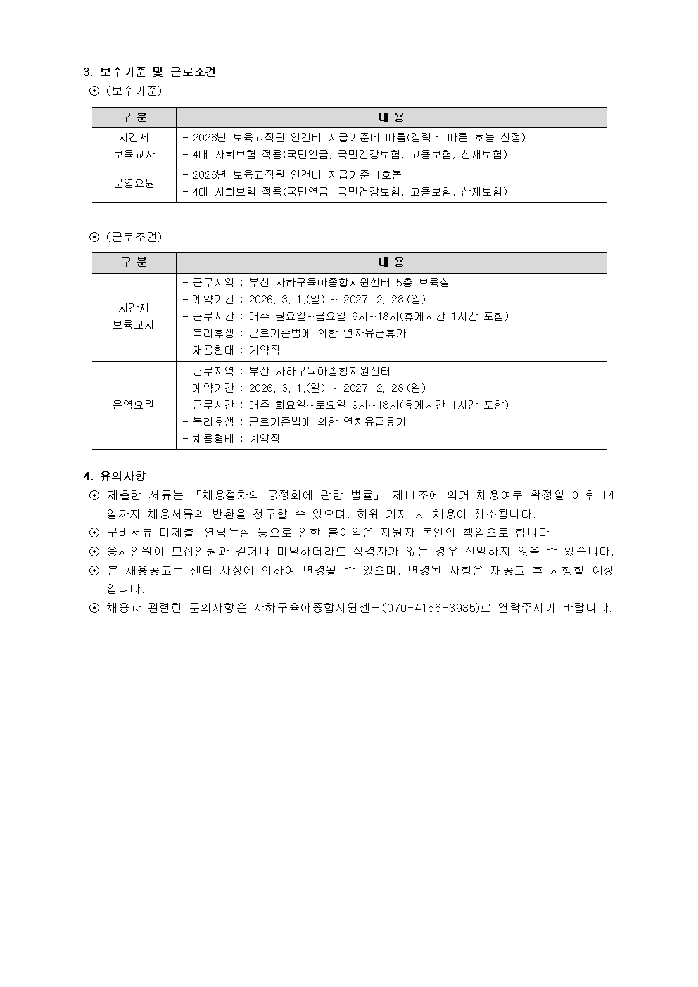 2-1. (사하구육아종합지원센터 공고 2026-2호) 사하구육아종합지원센터 직원(시간제보육교사, 운영요원) 채용 공고문.hwp