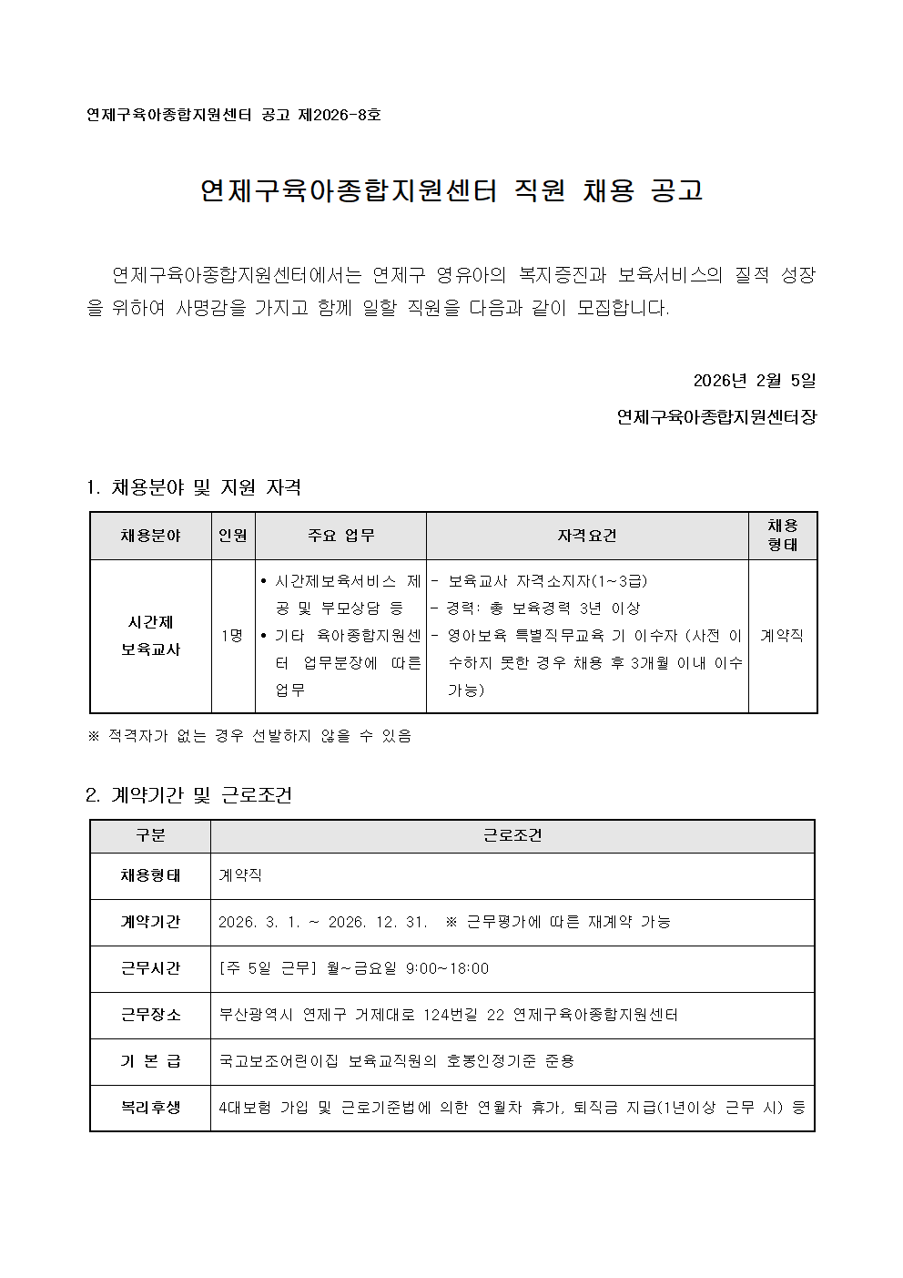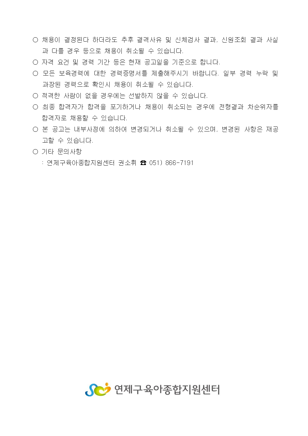 붙임1_연제구육아종합지원센터 직원(시간제보육교사) 채용 공고.hwp