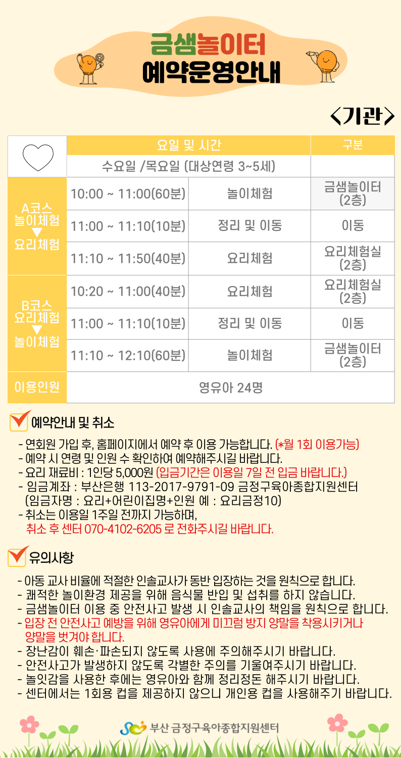 금샘놀이터 체험을 신청하려면 신청하기 버튼을 클릭한 후 신청서를 작성해 주시기 바랍니다.