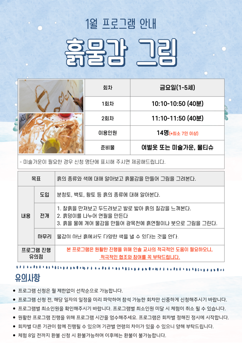 2. 1/9, 1/30은 생태미술체험이 진행되지 않으니 신청 시 참고해주시기 바랍니다.