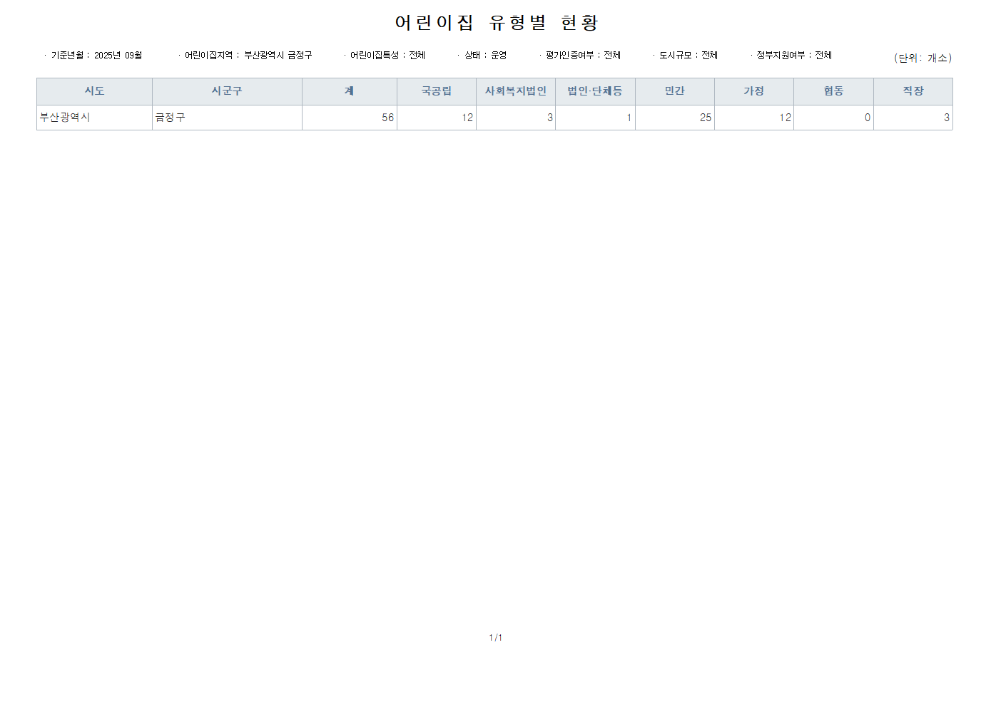 [어린이집현황] 부산광역시 금정구 어린이집 유형별 현황(2025년 9월 기준)