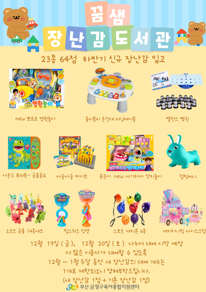 [하반기 장난감 대여 기간은 12/19(금)~12/20(토) 대여 시작할 예정입니다. 방문에 착오없으시길 바랍니다]