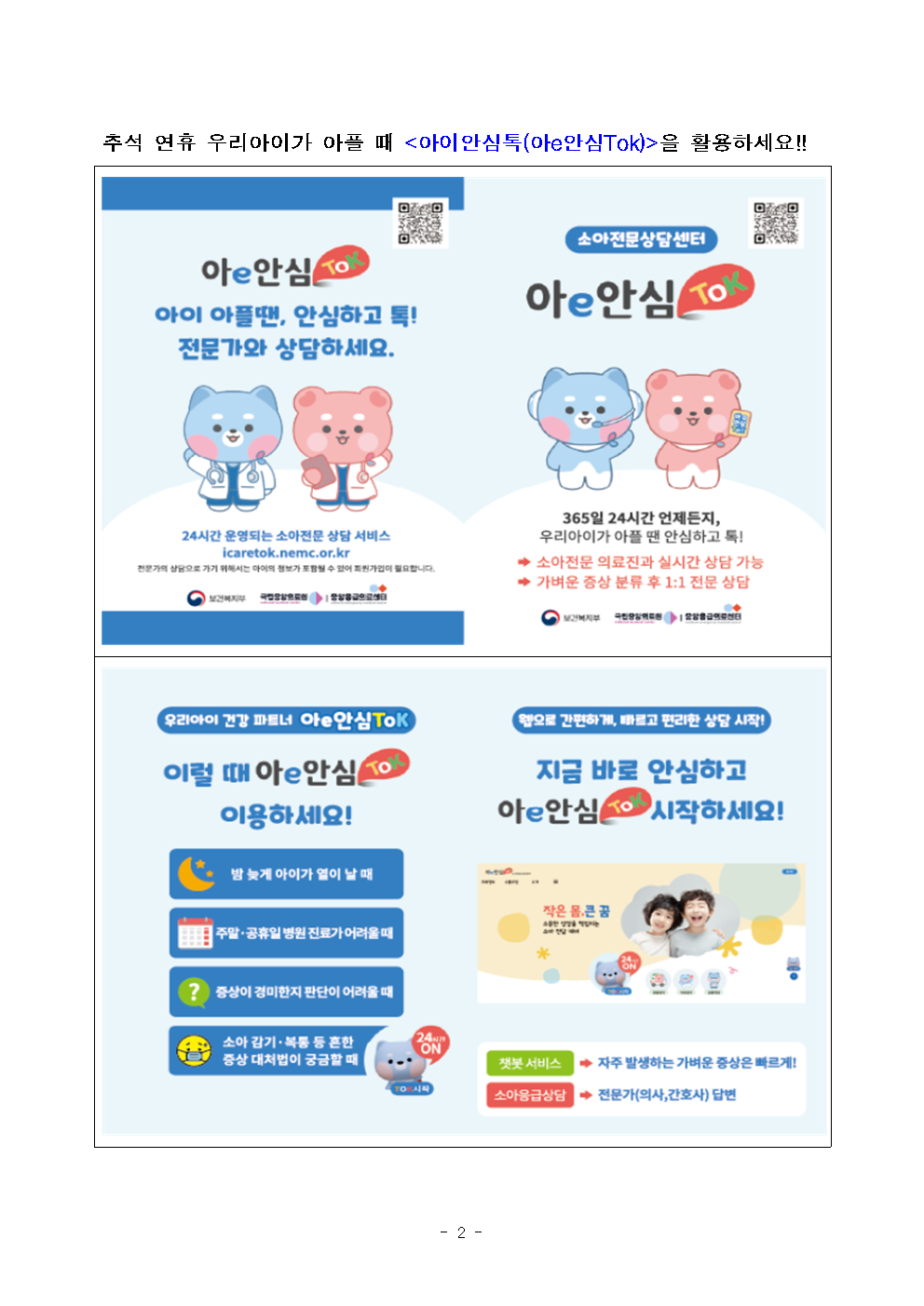 추석 연휴 기간 「응급똑똑 앱 아이안심톡 온라인 플랫폼」 이용 안내