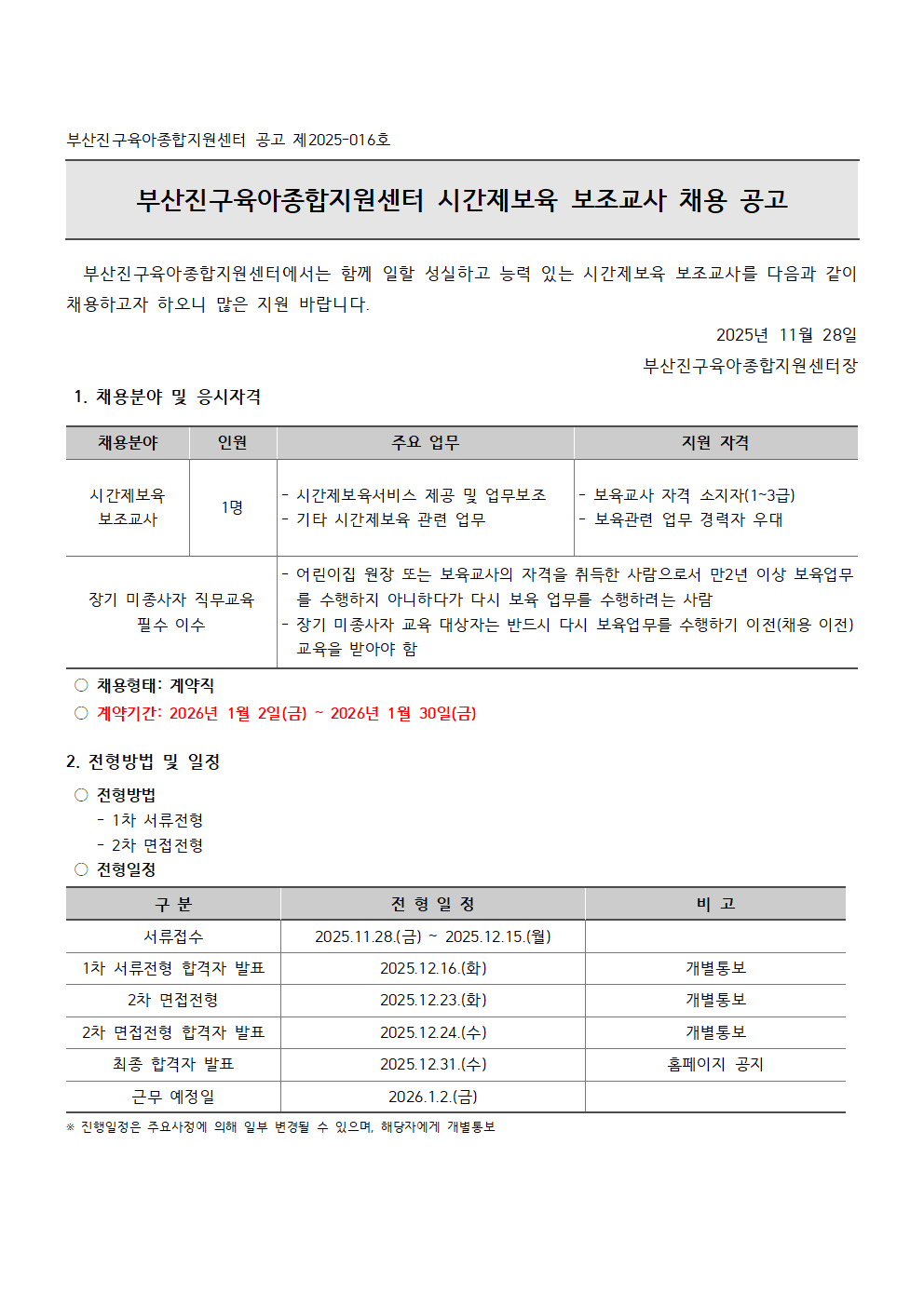 붙임 1. 부산진구육아종합지원센터 시간제보육 보조교사 채용 공고문 (1).hwp