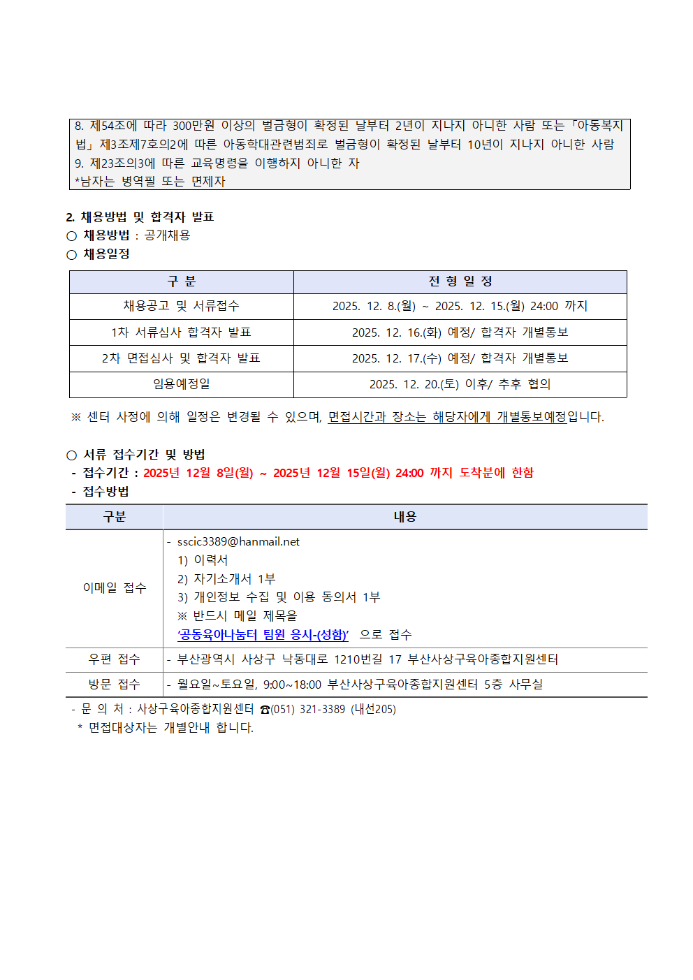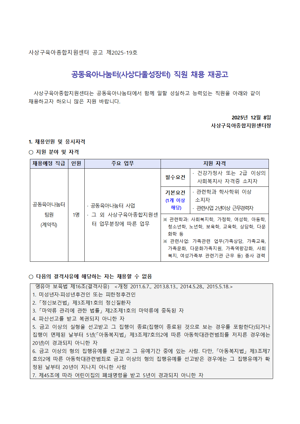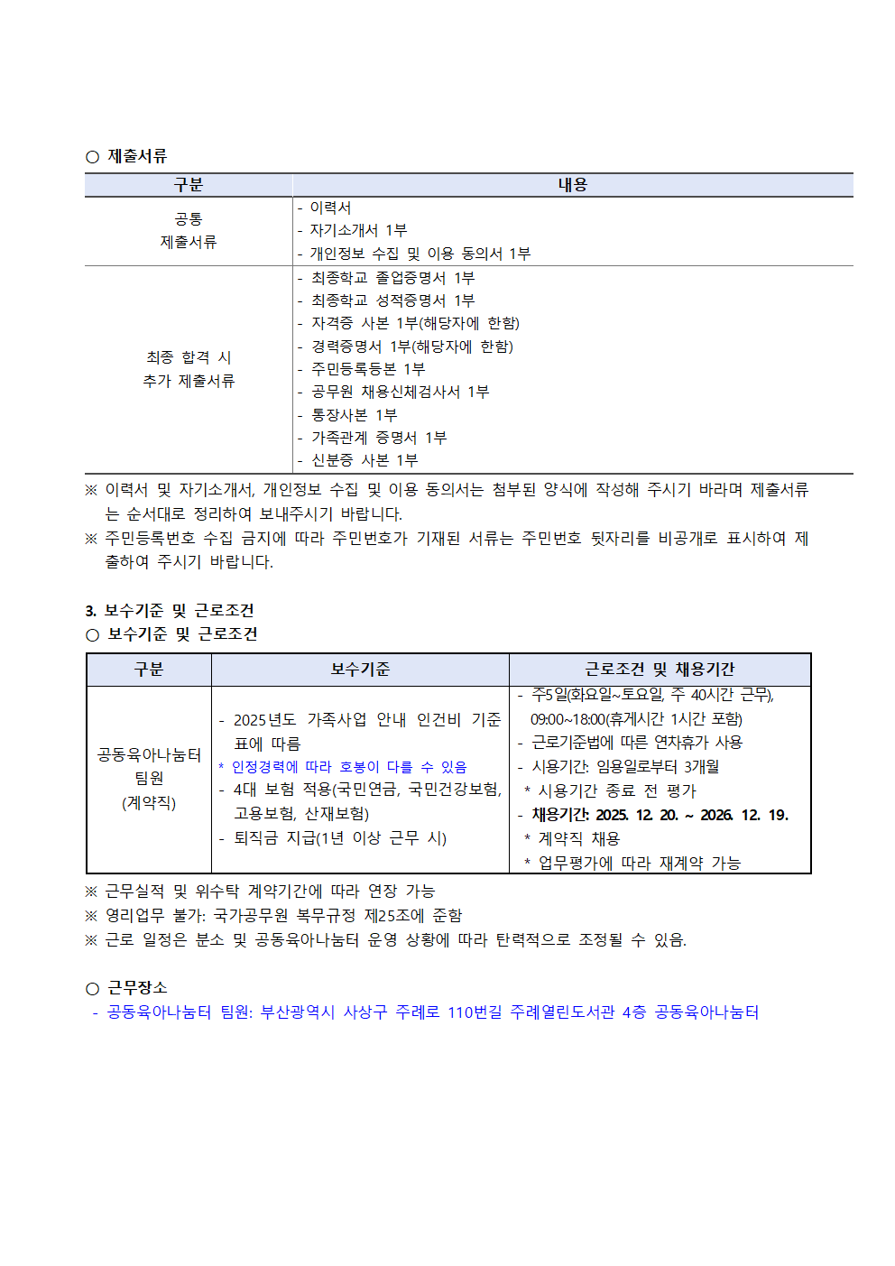 [사상구육아종합지원센터] 공동육아나눔터(사상다울성장터) 직원 채용 재공고